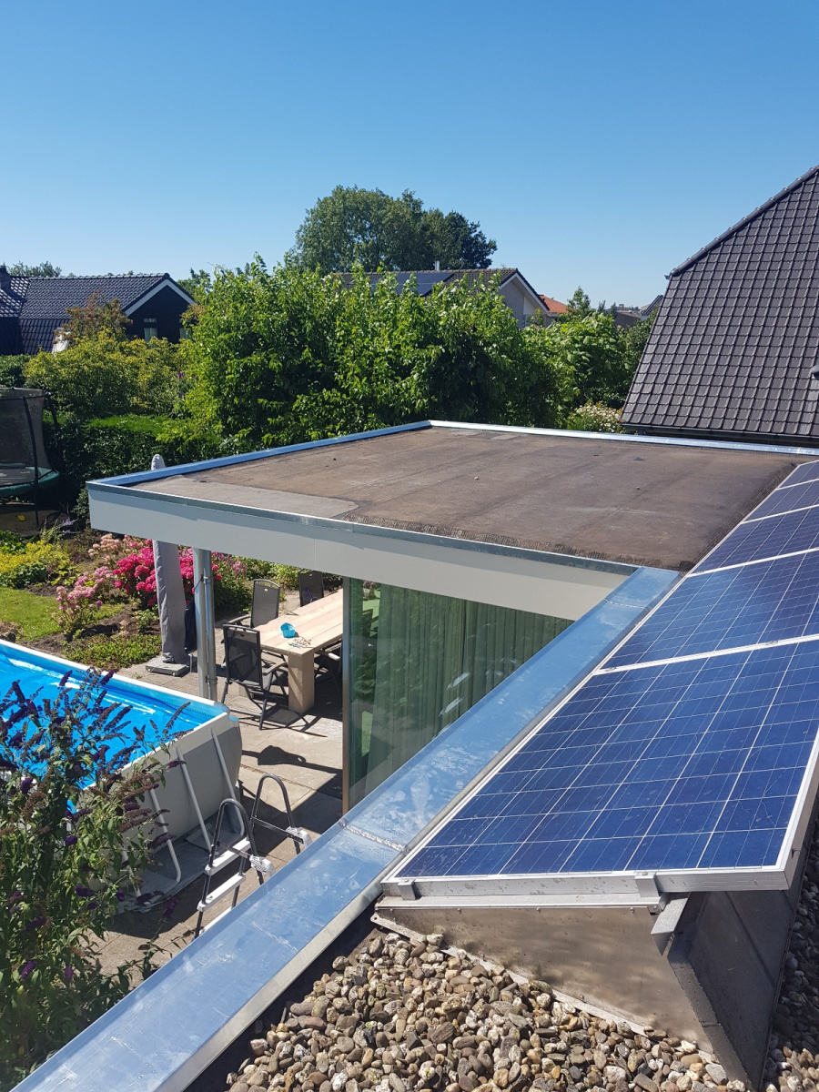 Op deze foto is een zorgvuldig bekleed muurtje te zien, volledig op maat uitgevoerd in duurzaam zink. Deze zinken bekleding biedt niet alleen een uitstekende bescherming tegen weersinvloeden, maar geeft het geheel ook een strakke en stijlvolle afwerking. Het vakwerk is duidelijk zichtbaar in de nauwkeurige aansluiting op de bestaande bouw en de nette afwerking van de hoeken en naden. Dankzij de toepassing van zink is dit detail onderhoudsarm en gaat het jarenlang mee, terwijl het esthetisch perfect aansluit bij het karakter van de woning.